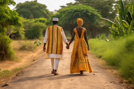 African couple in traditional wedding clothes walking at Africa town. Generative AI.