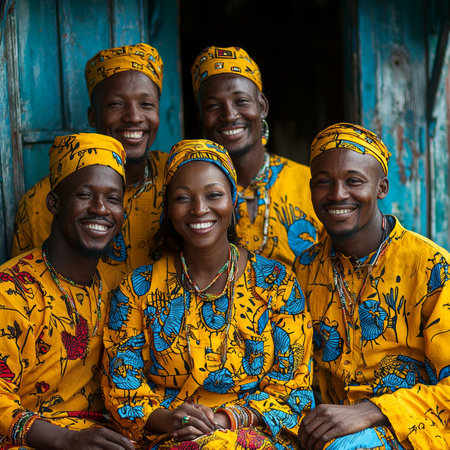 A cheerful group of people in culturally vibrant attire against a colorful backdrop. The scene conveys unity, friendship, and cultural identity, with bright yellow patterns symbolizing community and joy.