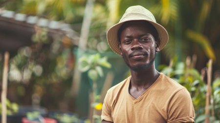 Portrait of smiling african american man in hat in countryside