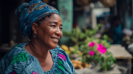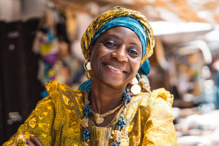 A woman stands proudly at a market wearing bright clothing and accessories. She shows joy and warmth while surrounded by the lively atmosphere of local vendors.