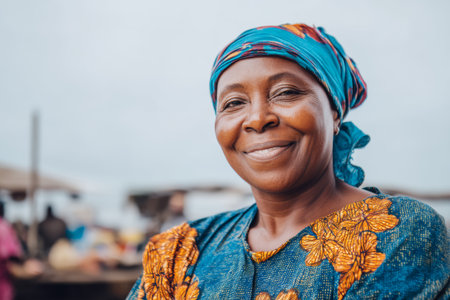 A woman smiles while standing at a bustling marketplace. She wears a colorful headscarf and traditional clothing as people shop and interact around her.