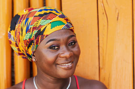 African woman with a hopeful happy smile and traditional headdress standing against a painted wooden wall in the tropical village of Keta Ghana, West Africa