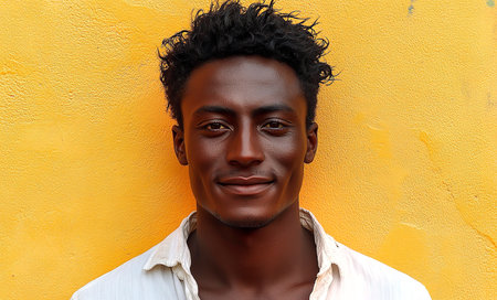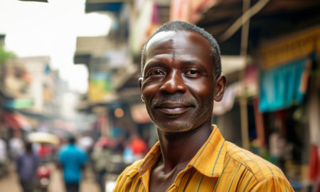 Smiling young African man in a yellow shirt against a vibrant urban backdrop. Capturing joy, positivity, and the lively atmosphere of the location.