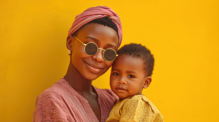 Smiling african female adult with child against yellow background.