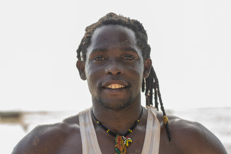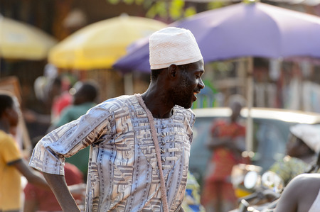 OUIDAH, BENIN - Jan 10, 2017: Unidentified Beninese man in white hat smiles at the local market. Benin people suffer of poverty due to the bad economy