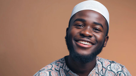 Portrait of a happy young african muslim man smiling against brown background