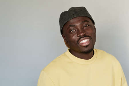 Portrait of happy young black guy in cap and yellow sweatshirt standing against isolated background