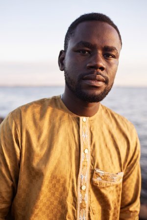 Vertical portrait of traditional Black man looking at camera outdoors in nature