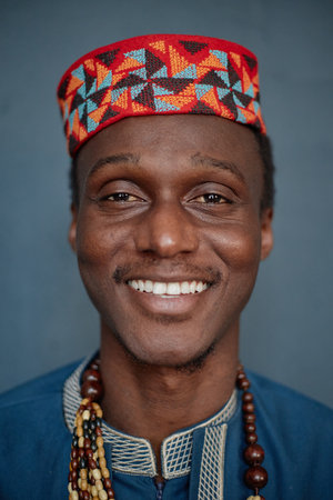 Portrait of young adult Black man smiling and looking at camera wearing patterned hat and traditional beaded necklace celebrating Kwanzaa against plain background