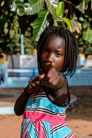 BOLAMA ISLAND, GUINEA BISSAU - MAY 6, 2017: Unidentified local little girl with braids looks ahead in the ghost town of Bolama, the former capital of Portuguese Guinea