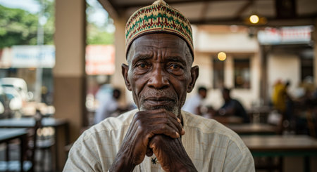 Portrait of a senior African man sitting at a coffee shop.