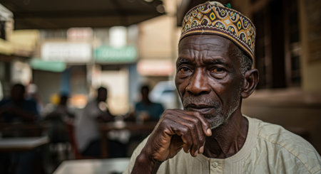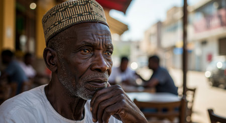 Portrait of an elderly African man sitting at a cafe in the street.