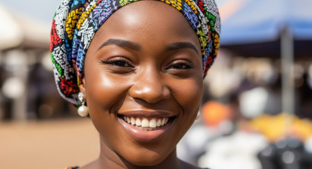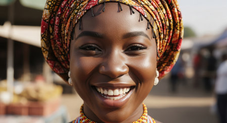 Young african woman in traditional clothes smiling at the local market.