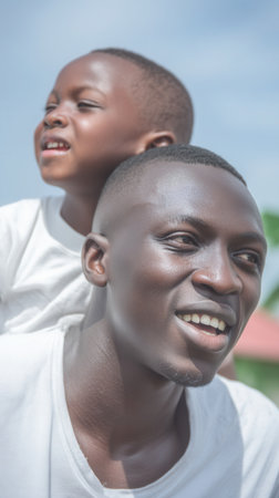 A close-up of a happy young African man and a child enjoying a sunny day. This image evokes feelings of joy, love, and family bonding. Ideal for fatherhood or lifestyle concepts.