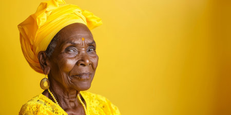 an African American elderly person in traditional yellow attire, with a serene expression on a yellow studio background
