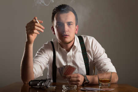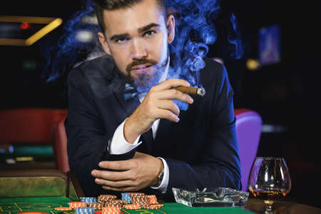 Stylish bearded Man in suit and scarf playing in dark casino, smoking cigar, drink whiskey.