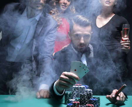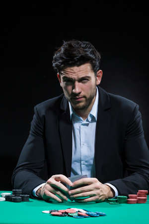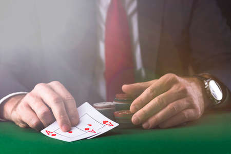 Businessman at green playing table with gambling chips and cards playing poker and blackjack in casino
