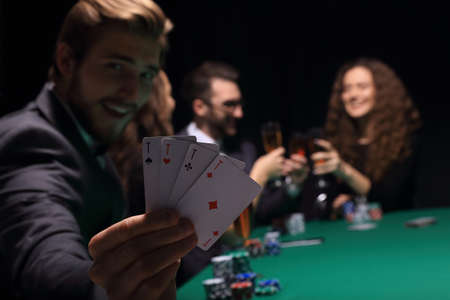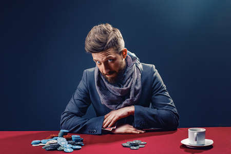 Beared man in suite is playing cards in a casino on red cloth on a table bluffing. Winner. Gambling