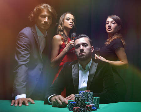 Kirov, Russia - December 19, 2018: Group of people with playing cards near table in a dark room with red light. Photo shoot in gangsters style