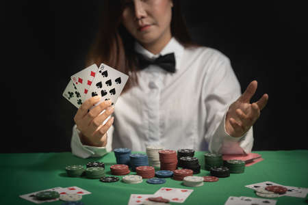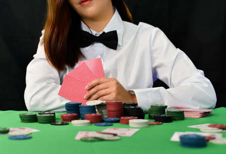 Asian woman dealer or croupier shuffles poker cards in a casino on the background of a table,asain woman holding two playing cards. Casino, poker, poker game concept
