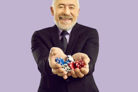 Close up of overjoyed old man handful of casino chips celebrate win. Smiling senior male poker player enjoy gambling and entertainment activity. Violet studio background. Luck and fortune.