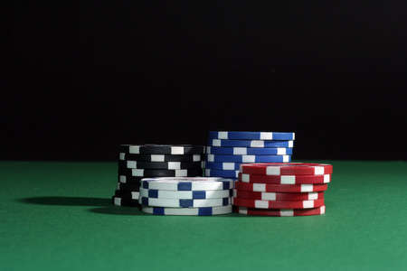 Blur background and chips, Stack of poker chips on a green table. Poker game theme.