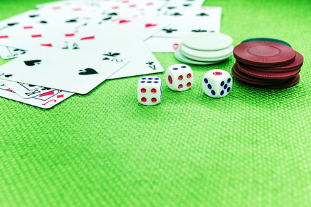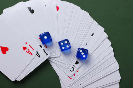 Dice with playing cards on a green background. Gaming addiction, poker, casino