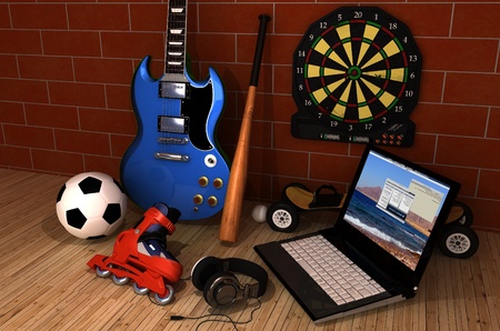 A vibrant display of various sports equipment, including a basketball, football, baseball, dumbbells, and a helmet, set against a rustic concrete background. Perfect for fitness themes.