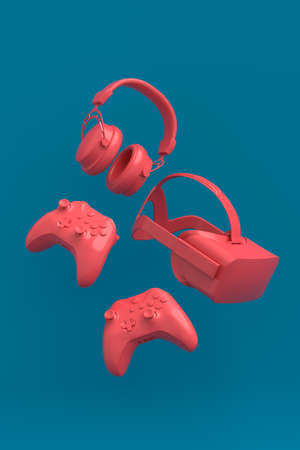 Flying monochrome gamer gears like VR glasses, headphones and joystick on blue and pink background. 3d rendering of accessories for live streaming concept top view