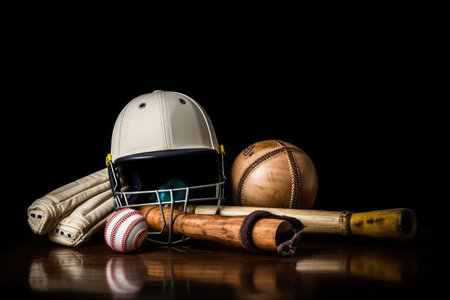 This image showcases a variety of sports equipment and apparel, including a jersey, bat, and different balls, arranged neatly on a dark background.
