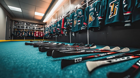 A row of hockey sticks lined up against a locker room wall, with jerseys hanging above them.