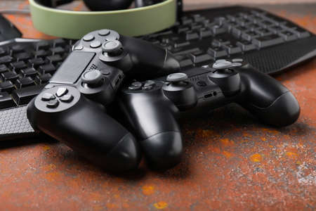Modern gamepad and gaming mouse lies with keyboard and headphones on table in dark playroom scene close up. Online video game players community concept