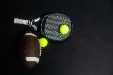 This image showcases a diverse array of sports equipment arranged together. It includes a basketball, soccer ball, baseball, tennis racket, boxing gloves, running shoes, and golf balls. The equipment is displayed on a dark background, highlighting the variety of sports that can be played with these items.