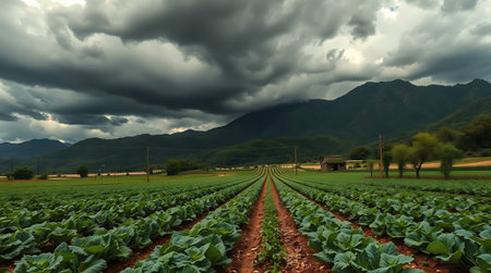 Dramatic sky and lush cabbage rows create a serene yet powerful scene. Showcase sustainable farming and the beauty of rural landscapes with this image.