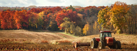 Red tractor on a field with a barn and autumn trees in the background. Concept of agriculture, rural life, farming, countryside.