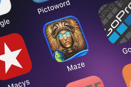 London, United Kingdom - October 05, 2018: Close-up shot of the Maze: The Broken Tower - Hidden Objects application icon from Big Fish Games, Inc on an iPhone.