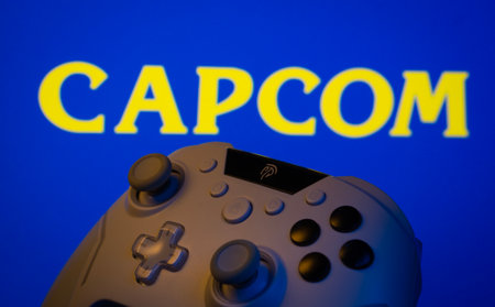 Dhaka, Bangladesh- 15 Sep 2025: A close-up of a gamepad with the Capcom seen on screen in the background.