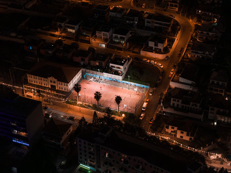 Aerial view of outdoor hockey field during night. The image contains soft focus, grain and noise.