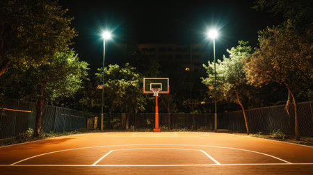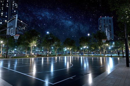 A vibrant basketball court shines under the night lights, surrounded by lush trees. The court is empty, showing the polished wooden floor and marked lines