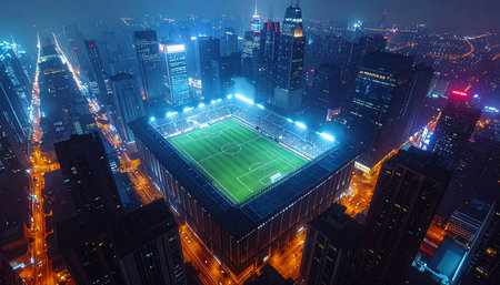 A striking aerial view of a football stadium illuminated during a night match in an urban city. The cityscape adds vibrant contrast to the scene.