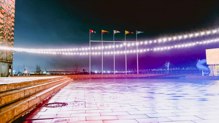 Abstract background of port in big city with neon glow of light bulb garland. Travel Saint-Petersburg Russia. Flags and ships at night dock. Soft focus. film grain pixel texture. Defocused.