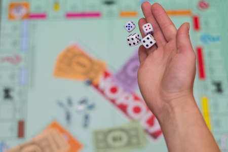 Hand throws the dice on the background of colorful blurred fantasy Board games, gaming moments in dynamics