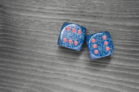 On a rustic wooden table, two dice adorned with vibrant red and blue dots are resting side by side, inviting you to join the fun