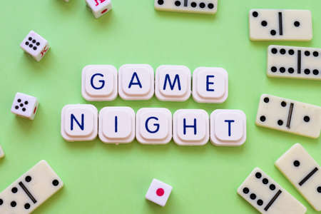 Game night words made with board game letters, on a green background, surrounded by dice and dominoes. Playing concept, dominoes and board games