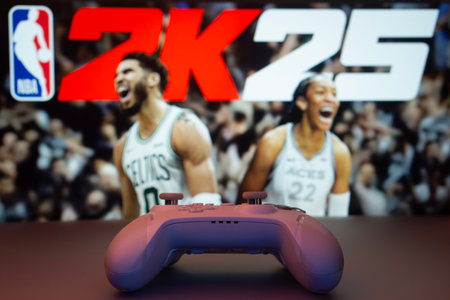Dhaka, Bangladesh- 03 July 2025: A close-up of a white gamepad with the NBA 2K25 seen on screen in the background.