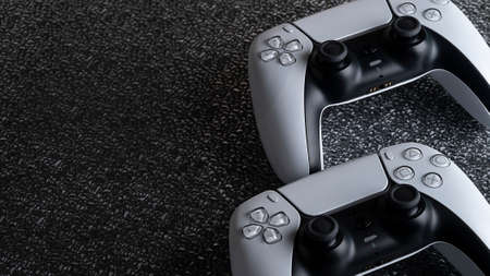 Moscow, Russia - March 8 2021: Presentation of a new product from Sony, wireless white PlayStation 5 gamepads isolated on background of synthetic glass of crushed ice. Concept of gaming