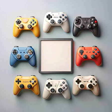 A vibrant collection of six colorful video game controllers arranged symmetrically around a blank white frame. Perfect for gaming. technology. and entertainment concepts.