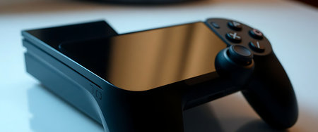 Black joystick gaming controller on brown background , video game console developed Interactive entertainment