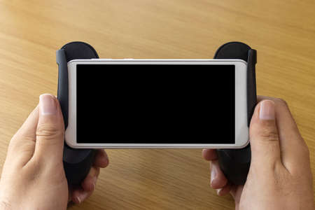 Black gaming joystick with smartphone installed into holder in gamer hands, with blank black screen, Game controller in hand, turned off, Isolated on white background