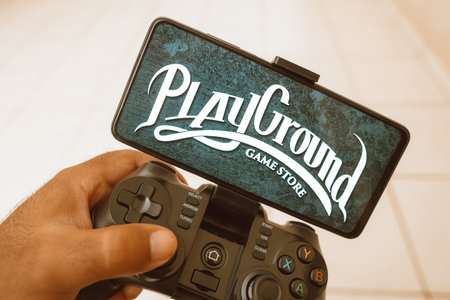 August 11, 2023, Brazil. In this photo illustration, a person plays on a joystick and the PlayGround Game Store logo displayed on a smartphone screen